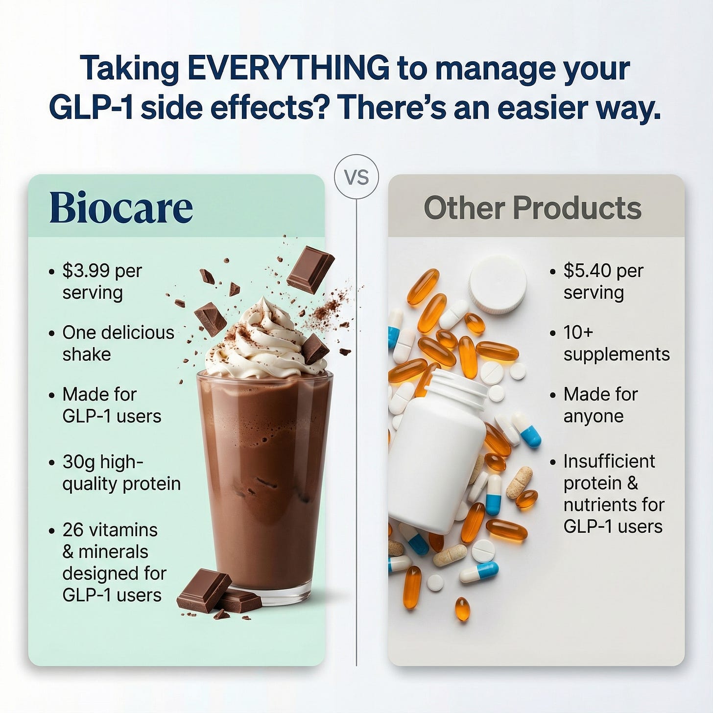 And before BioCare, that meant protein shakes plus a small pharmacy worth of supplements, vitamins, and minerals. All of it. Which adds up fast, in cost, mental load, and honestly, how much your body has to process every day.